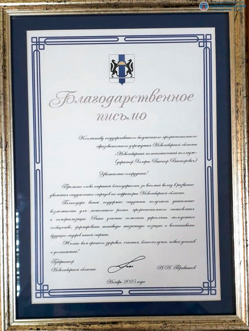Новосибирский политехнический колледж не остался в стороне и оказал активную поддержку студенческим отрядам Новосибирской области. Директор колледжа Виктор Викторович Эллерт в качестве почётного гостя был награждён на торжественном мероприятии Благодарственным письмом от Губернатора Новосибирской области Андрея Александровича Травникова за весомый вклад в развитие студенческих отрядов на территории Новосибирской области.