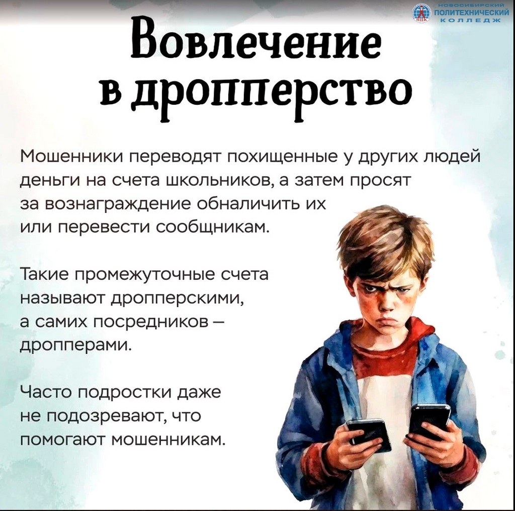 Министерство образования Новосибирской области информирует о возможном вовлечении студентов в мошеннические схемы и предоставляет материалы по предупреждению приобщения подростков к совершению незаконных финансовых операций и неправомерного оборота средств платежей, в том числе дропперство.
