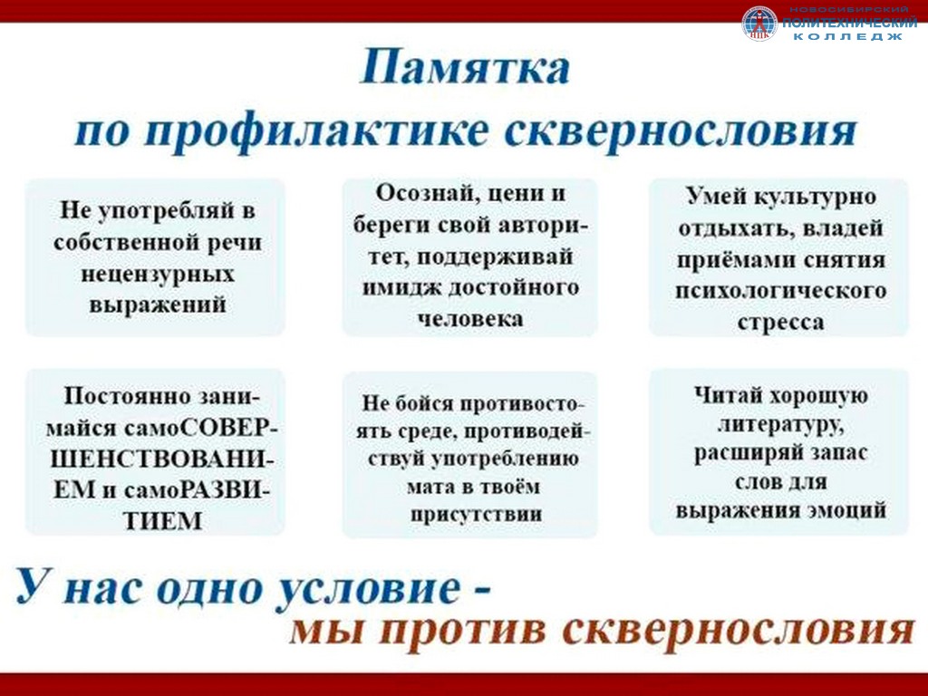 В рамках этой даты в Новосибирском политехническом колледже прошел тематический час, посвященный культуре общения. Главной задачей встречи стало не просто информирование о запретах на нецензурную брань, а формирование осознанного отношения к каждому сказанному слову.