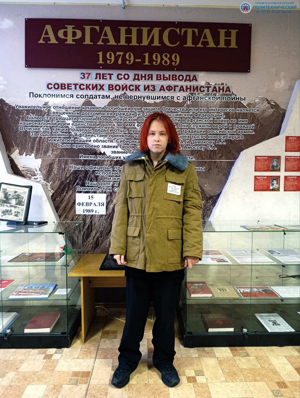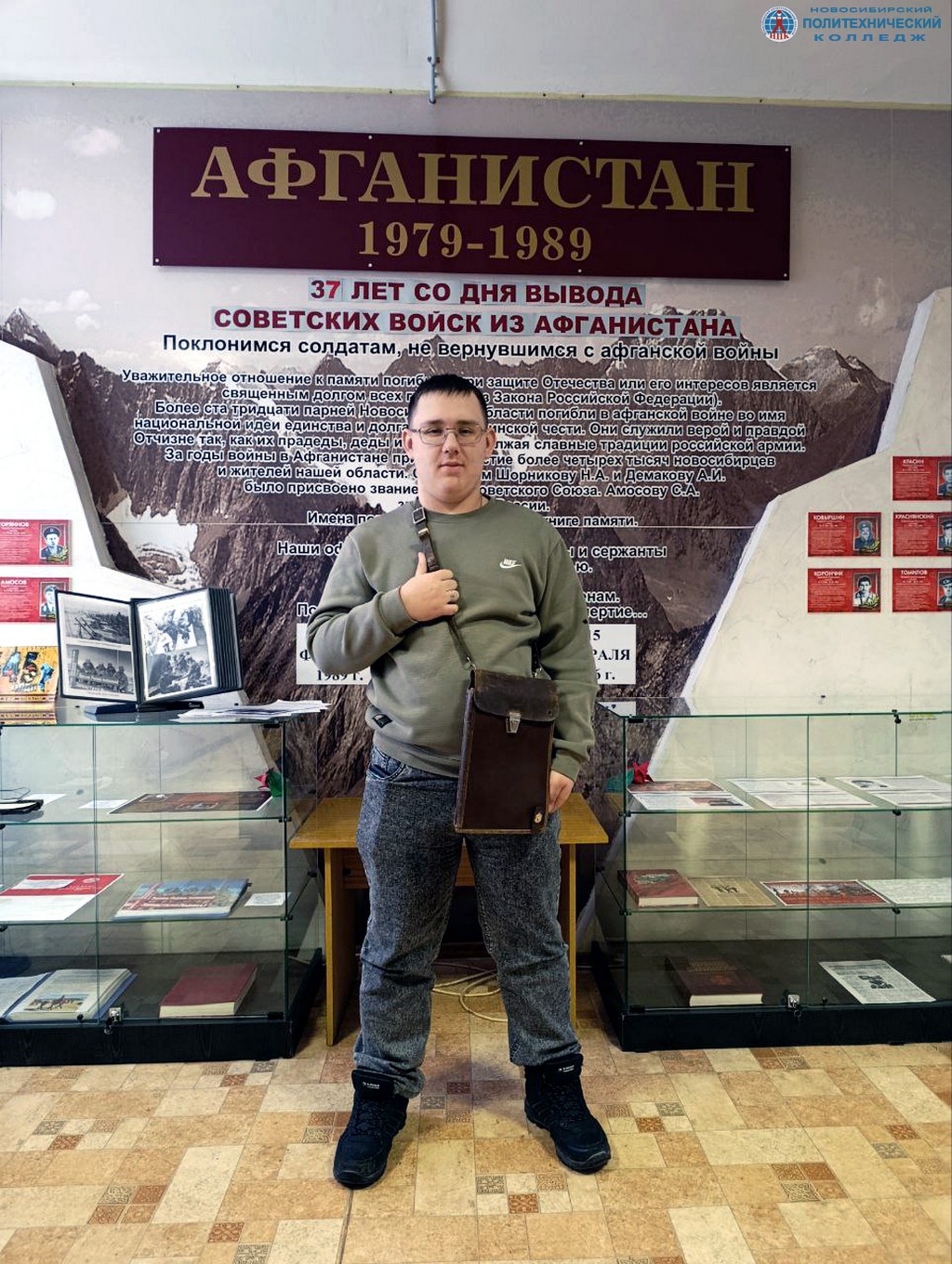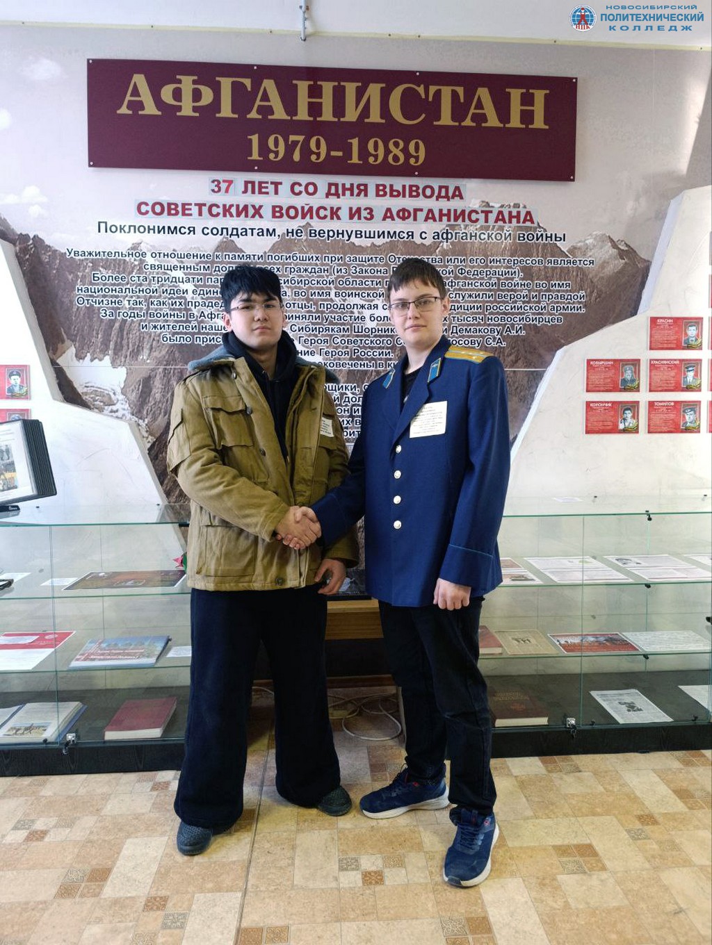 Во время экскурсий, проведенных для студентов групп 025 ИСП, 125 ИСП, 225 СА, 725 МО, 1025 МСМП педагогом-библиотекарем Голубцовой Натальей Михайловной, ребята познакомились с событиями тех лет, с биографией Негатина Юрия Леонидовича - выпускника ГПТУ-55, героически погибшего в начале Афганской войны, а также с документами и экспонатами, переданными в дар Музею нашими земляками - ветеранами-афганцами Советского района.
