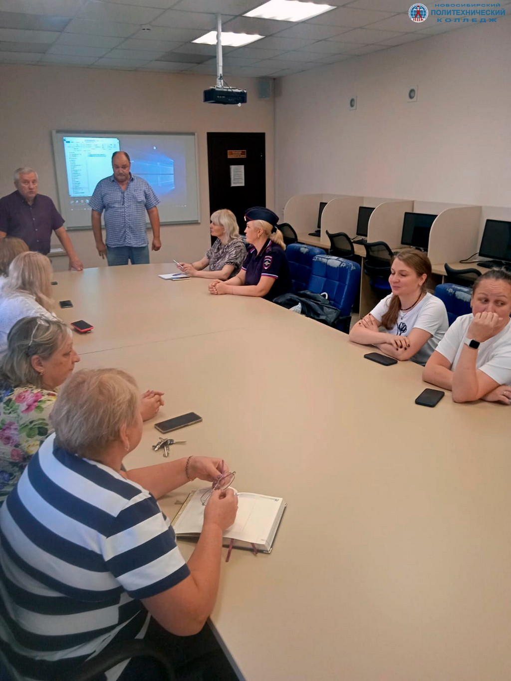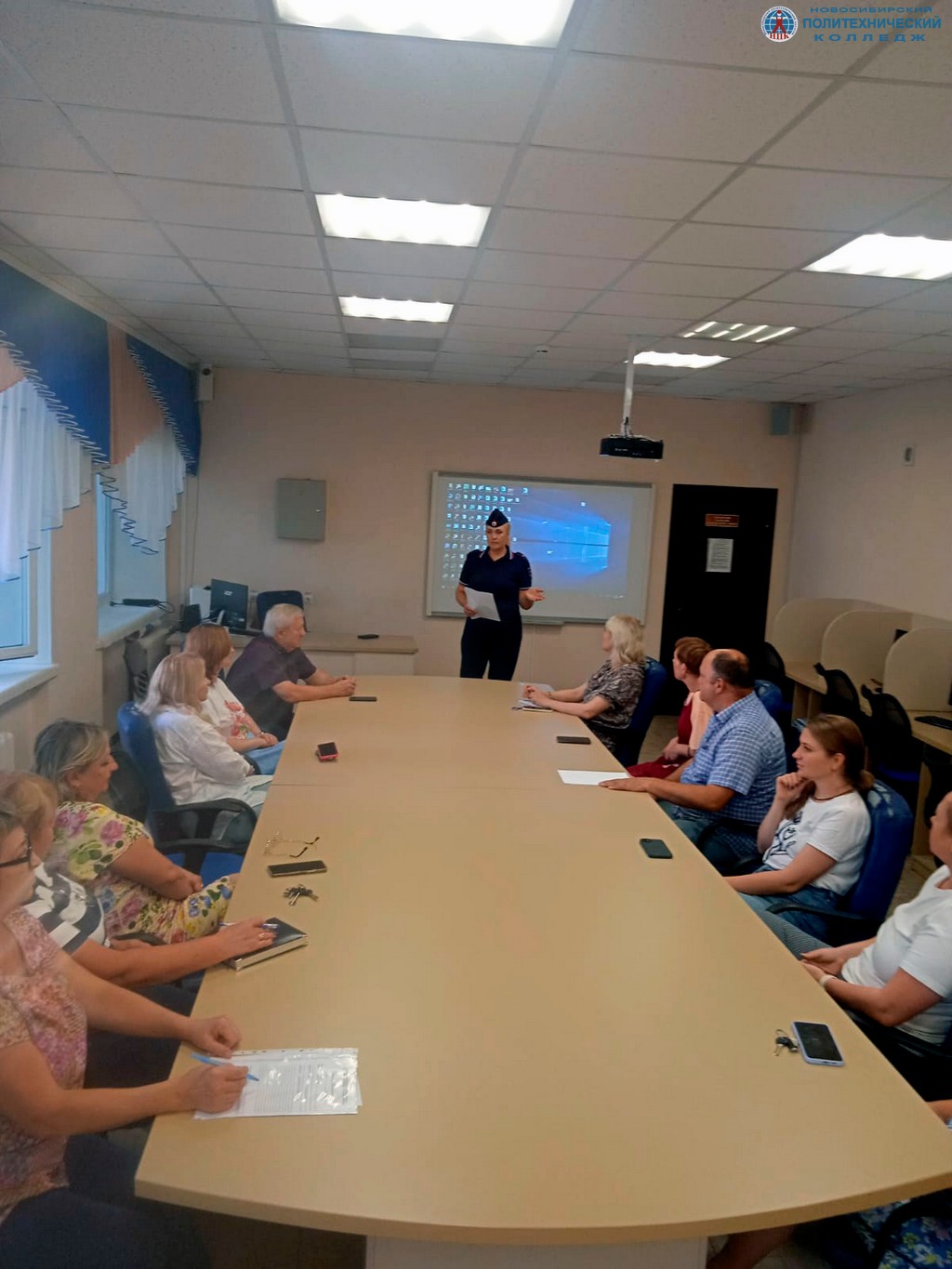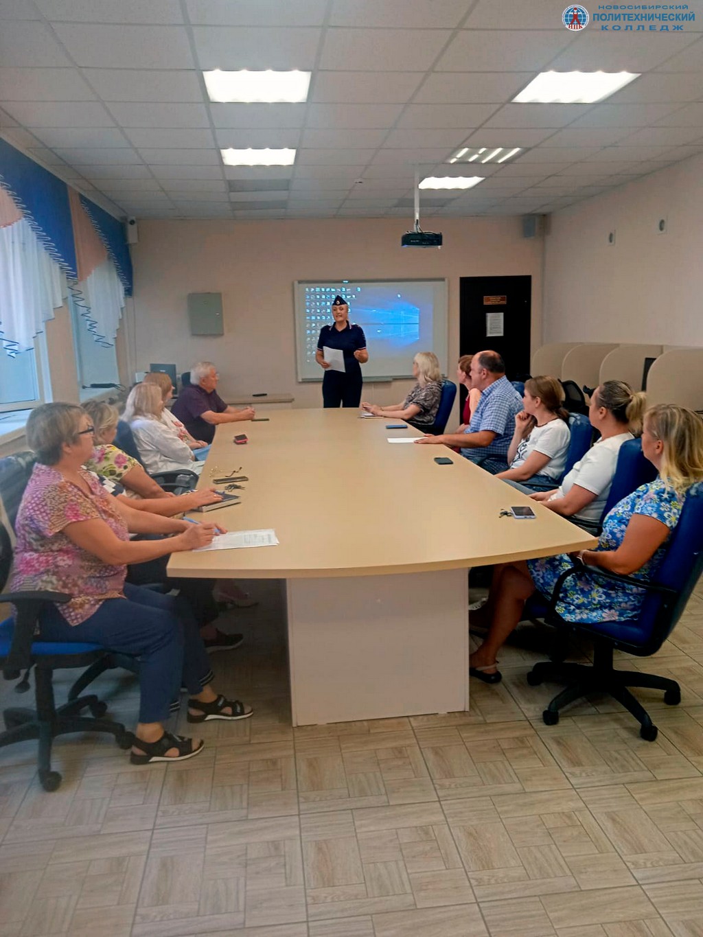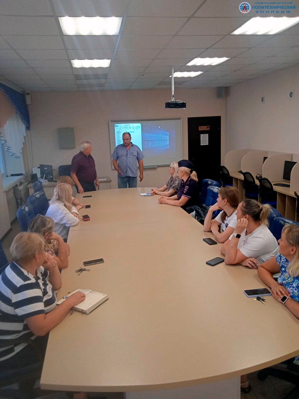 С сотрудниками колледжа и охраной был проведен подробный инструктаж по алгоритму действий при вооруженном нападении на объект (территорию) образовательной организации и обнаружении после нейтрализации нарушителей размещенного в здании образовательной организации взрывного устройства, а также были подробно рассмотрены случаи, когда эвакуация невозможна. На собрании присутствовала заместитель начальника Советского отдела полиции №10, УМВД России по г. Новосибирску, подполковник полиции Звягинцева Олеся Викторовна.