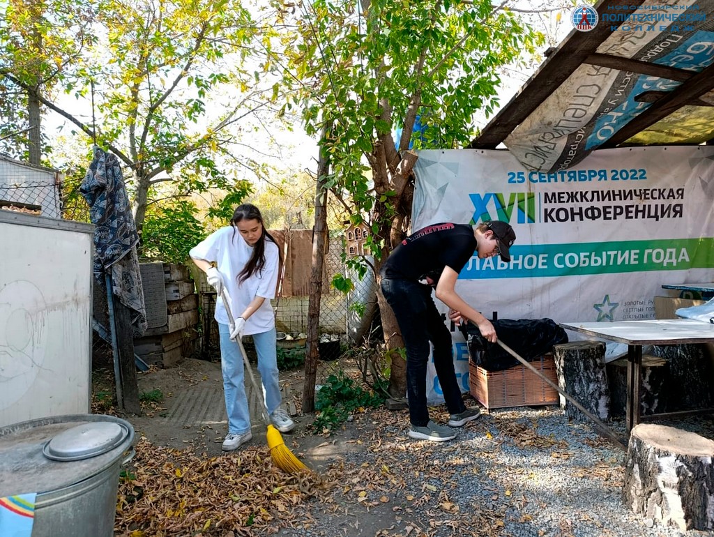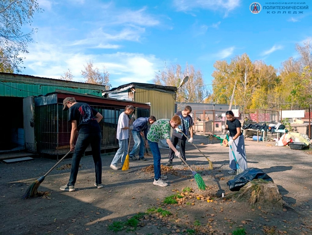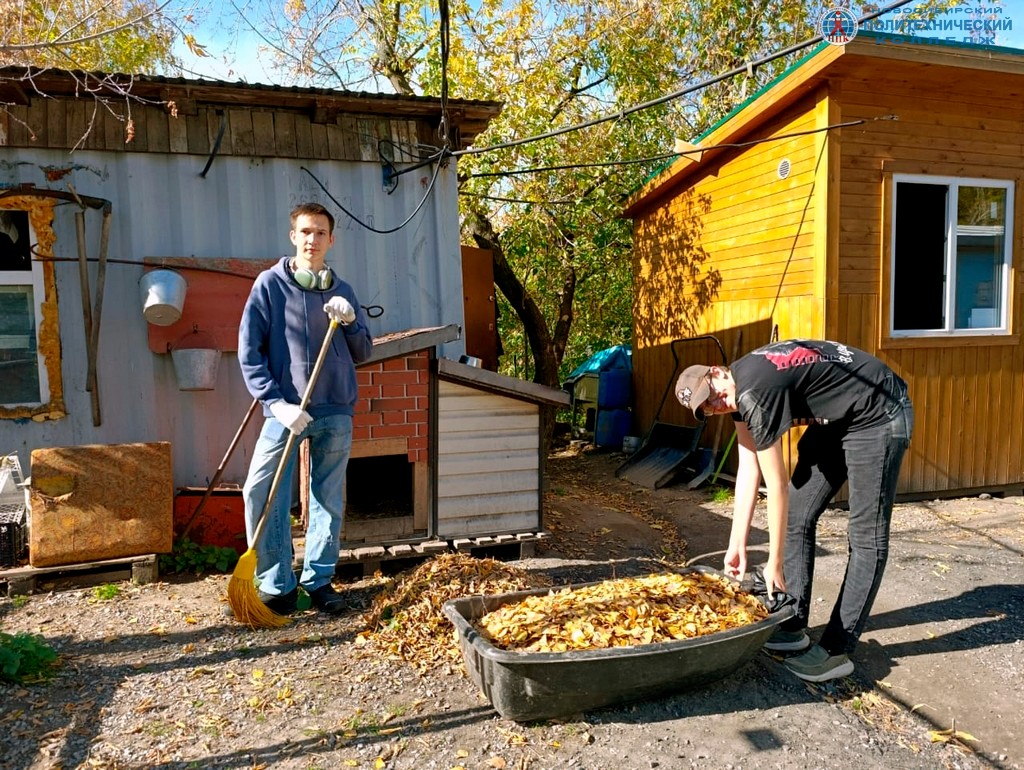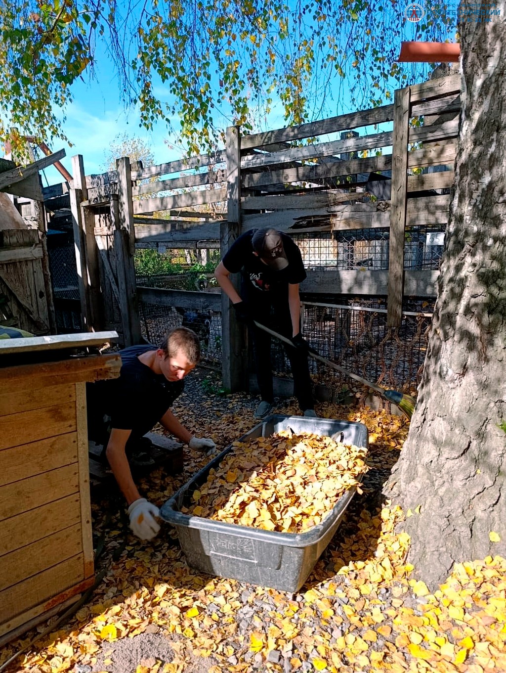 Наши ребята, вооружившись метлами, с энтузиазмом взялись за дело. За несколько часов активной работы нам удалось очистить большую часть территории приюта от листвы. А волонтер Бону Нурматова из гр.525 ПКД помогла еще и с подготовкой еды для собак.